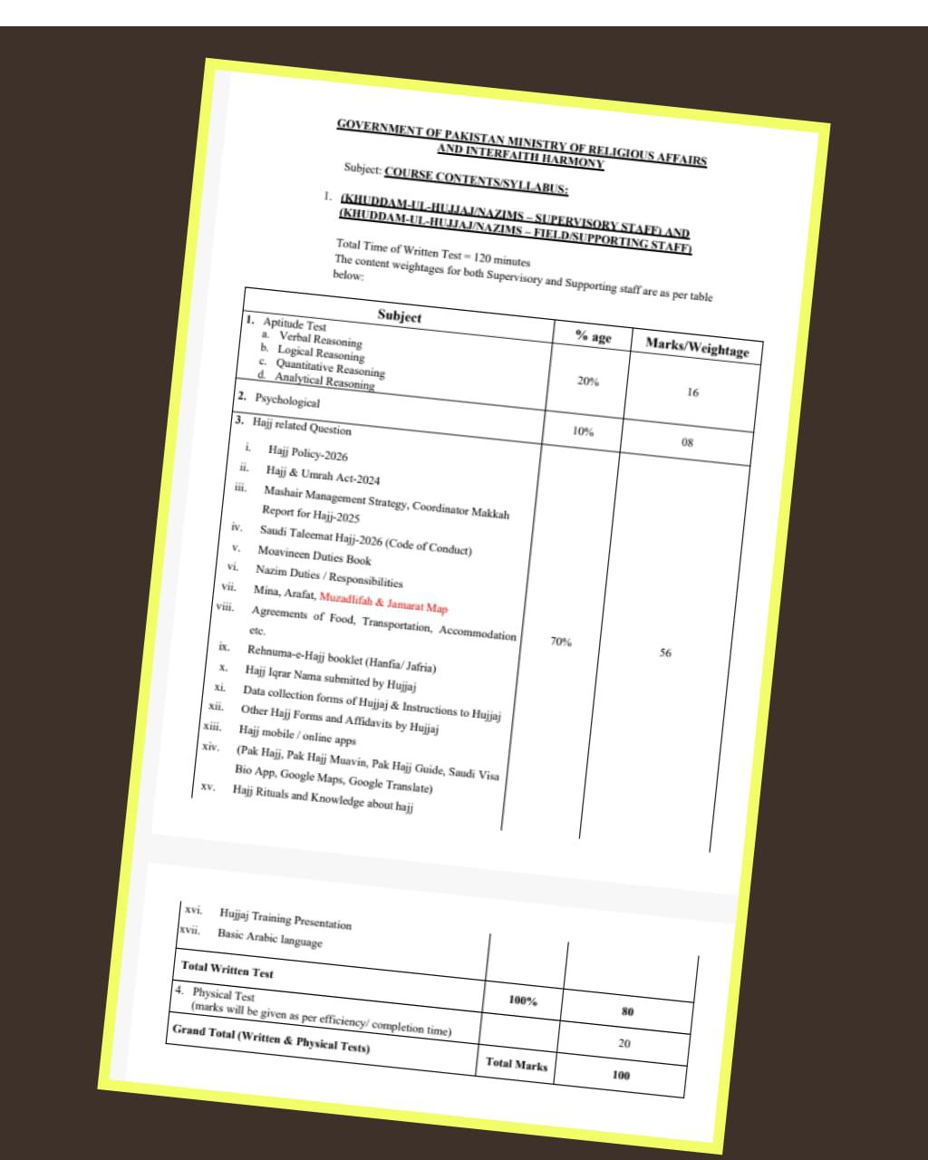 Ministry of Religious Affairs and Interfaith Harmony – Screening Test for Moavineen-e-Hujjaj / Nazims for Hajj Operation 2026”.